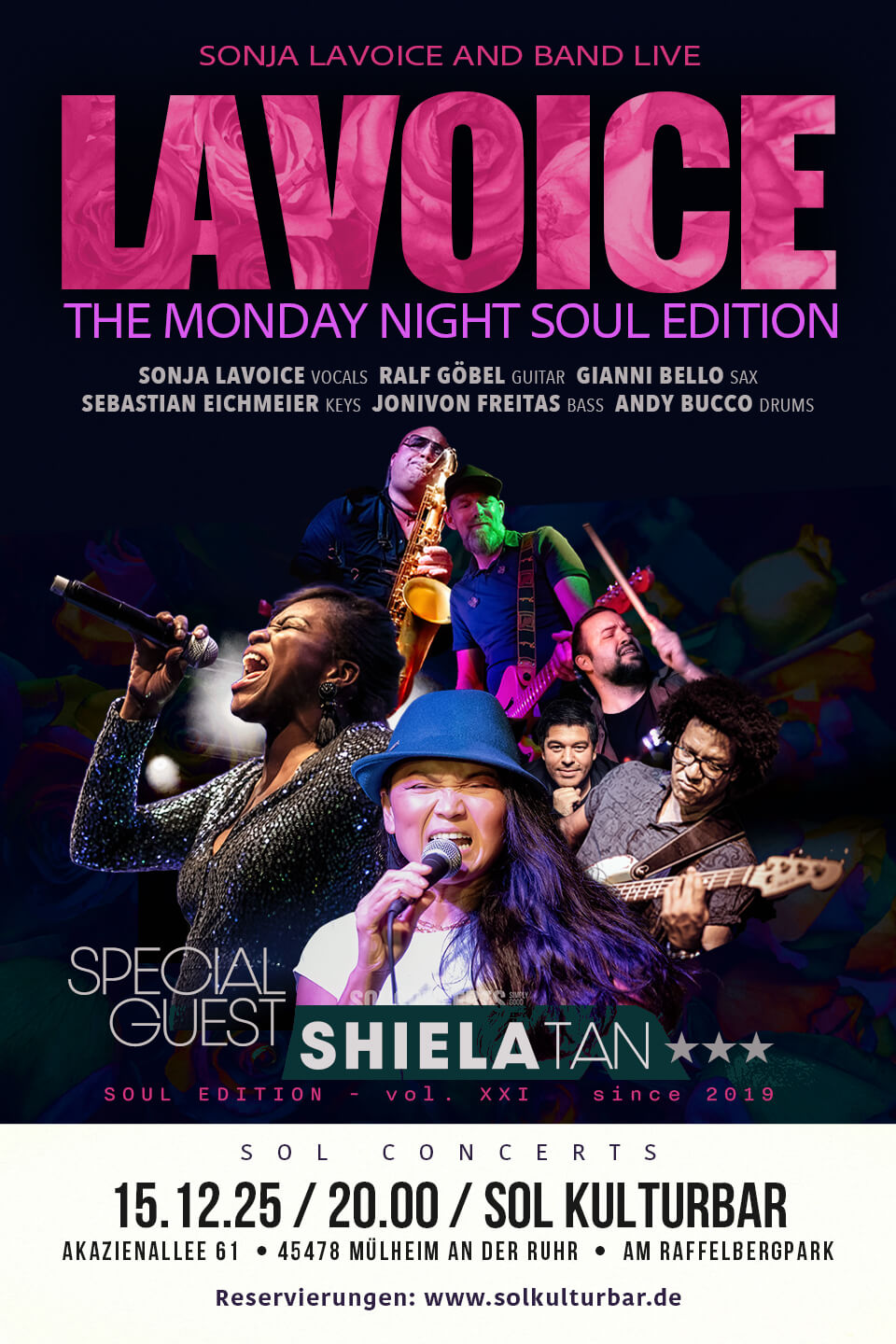 Am 15.12.25 geht’s wieder los! The Monday Night Soul Special bei den Sol Concerts in Mülheim an der Ruhr! Nach unserem gefeierten Jubiläumskonzert im Juni, haben wir zu unserem letzten Konzert 2025 wieder einen ganz besonderen Gast als Bonbon eingeladen: Shiela Tan! Also: „back2TheClub“ – schnallt Euch an, komm rum und feiert mit uns wieder eine mitreißende Soul Night Party.